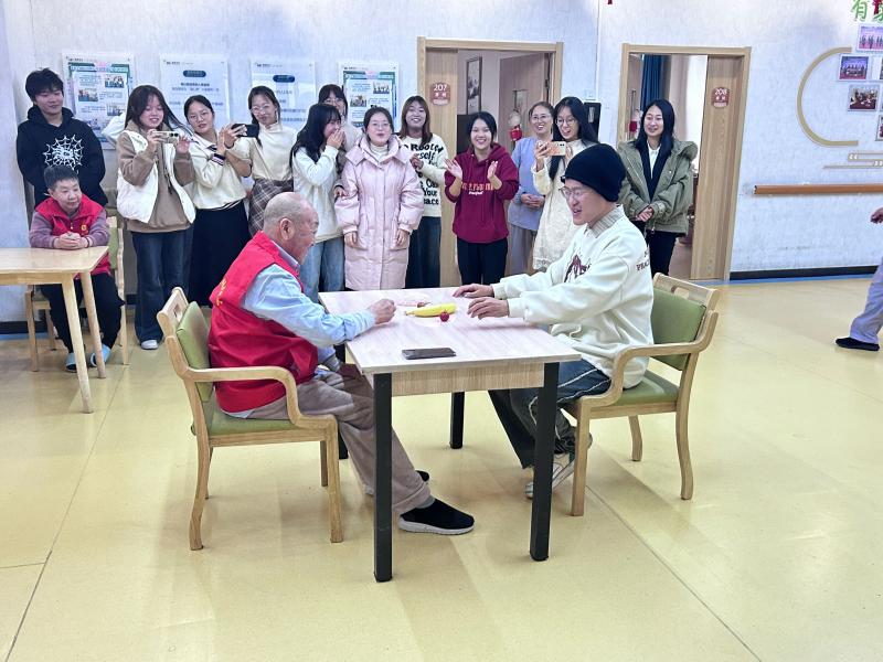 随后,同学们为恒大社区幸福服务养老中心的老年人带来了文艺表演。刘宇浩同学进行“五只蚂蚁搬大米”热身小游戏活跃了现场氛围,以新型方式提升老人们的参与感。2023级同学演唱歌曲《荷塘月色》和2022级强芸同学的舞蹈,给予老人们无限的欢声笑语。歌曲《赤伶》的演唱,使老人们为如今科技与戏曲的碰撞感到赞叹。诗朗诵《少年中国说》的表演更好的表现出我们这一代青年拥有的模样。屋外寒风呼呼,屋内暖意浓浓。