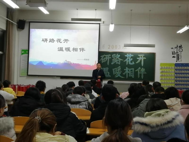 为充分调动学生考研积极性,进一步加强同学们考研的决心与动力。思政系2021年11月16日晚19:30在2-A501举办了2022届考研动员会。党总支书记武瑞荣、主任翟翠玲、副书记宫东红、副主任康小兵、毕业班班主任、辅导员以及全体大四学生参与了此次大会。大会由分团委书记李鸿凯主持。