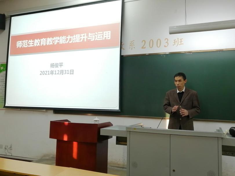 杨俊平老师紧密结合自身教学实际与师生进行了交流。首先,杨俊平老师教育教学实践能力测试,主要考察申请教师资格人员应具备的新教师基本素养、职业发展潜质、教育教学实践能力。其次,他指出教育教学测试内容与要求,主要包括:职业认知、心理素质、仪表仪态、言语表达、思维品质、教学设计、教学实施。再次,他阐释了测试的流程,主要结构包括备课、回答规定的问题、试讲、答辩。最后,他分享了如何在有效的时间内提升成功的可能性,教学非一日之功,而在于长期积累和实践,要善学习、善积累、善应运。同时对与会师生存在的问题进行了交流。
