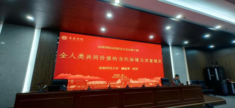 为深入学习贯彻习近平新时代中国特色社会主义思想,深化对构建人类命运共同体的理解与认识,10月16日下午,必威西汉姆联第十期马克思主义论坛在弘智楼八层会议室召开。论坛由思政部(系)党总支书记赵东旭主持,首都师范大学政法学院杨生平教授做了题为《全人类共同价值的当代语境与双重规定》的专题报告。