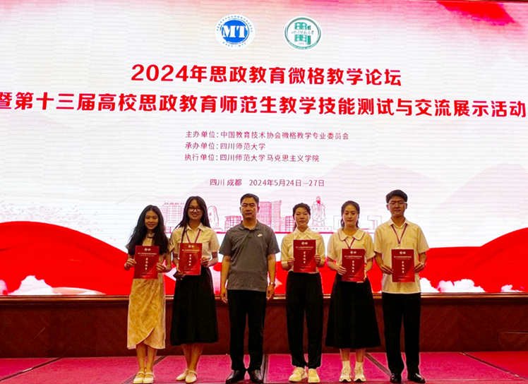 5月24日—27日,由中国教育技术协会微格教学专业委员会主办,四川师范大学必威BETWAY西汉姆联承办的2024年思政教育微格教学论坛暨第十三届高校思政教育师范生教学技能测试与交流展示活动在四川成都举行,来自陕西师范大学、西南大学、华中师范大学、东北师范大学、华南师范大学、四川师范大学等全国各地88所高校的547名本科生和硕士研究生参加比赛。我校必威BETWAY西汉姆联康小兵、任翠老师带队,思想政治教育专业5名学生参赛,全部获奖。其中潘意获二等奖,靳琴瑶、贾淑婷、王杰、刘宇浩获三等奖。
